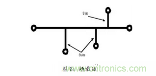 如圖6所示短截線會(huì)產(chǎn)生反射,同時(shí)也潛在增加輻射天線的可能。雖然短截線長(zhǎng)度可能不是任何系統(tǒng)已知信號(hào)波長(zhǎng)的四分之一整數(shù),但是附帶的輻射可能在短截線上產(chǎn)生振蕩。因此,避免在傳送高頻率和敏感的信號(hào)路徑上使用短截線。