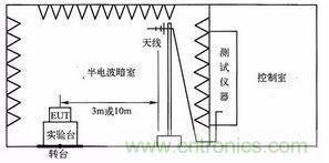 a)電場輻射:也是分臺式與落地式,與傳導發射相同(因為輻射發射結果與產品布置的關系 尤為密切,因此需要嚴格按照標準布置包括產品、輔助設備、所有電纜在內的受試品);