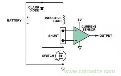 本例將詳細介紹一種典型的高端電流檢測應用。圖1所示為汽車應用環境中用于監控電磁閥或其它感性負載的常見配置。