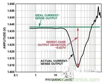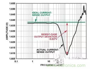 圖2所示為輸入在較寬頻率范圍內變化時電流傳感器的直流輸出與其理想值的偏差情況。從圖中可以看出,在1 MHz至20 MHz的頻率范圍內,偏差最為顯著(》0.1 V),且3 MHz時直流誤差達到最大值(1 V),這在放大器0 V至5 V的輸出電壓范圍中占據很大比例。