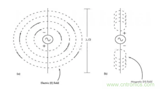 圖1展示了典型的半波偶極子天線是如何產生電場和磁場的。轉發后的信號被調制為正弦波,電壓呈極性變化,因此在天線的各元件間生成了電場,極性每半個周期變換一次。天線元件的電流產生磁場,方向每半個周期變換一次。電磁場互為直角正交。