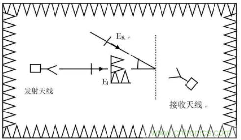 測試近場工作區反射電平時,發射天線先置于暗室中心軸線上,接收天線置于正對被測墻壁的一個合理位置,并沿兩天線軸線移動一段距離進行反射電平的測試。測試位置如圖所示。