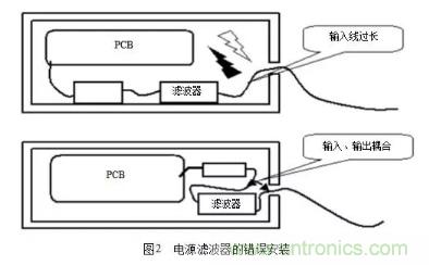 主要考慮(1)抑制工作頻帶以外的干擾;(2)在信號電路中用吸收濾波器消除無用的頻譜成分;(3)在電源電路(尤其是開關電源中),操縱電路,控制電路,以及轉換電路中消除產生的干擾。在工程實際中,一個最值得注意的地方是電源濾波器的安裝,常見的濾波器的錯誤安裝如圖2所示。