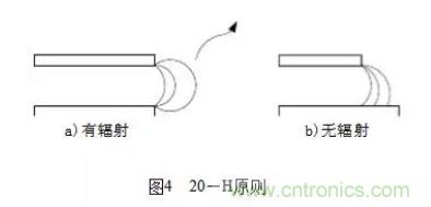 (1)20-H原則,決定印制線條間的距離,表述如下:所有的具有一定電壓的PCB都會向空間輻射電磁能量(如圖4a),為減小這個效應,PCB的物理尺寸都應該比最靠近的接地板的物理尺寸小20H(其中H是兩層PCB的間距),即3mm左右,這樣可使輻射強度下降70%(如圖4b)。20-H原則示意圖如圖4所示: