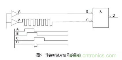(3)保證信號在PCB上可靠的傳輸,確保信號的完整性。這里面主要的問題一般包括時延、阻抗不匹配、地彈跳、串音等。這不但影響到電子器件的穩定工作,還會產生電磁干擾。一般在高速邏輯設計中最容易碰到時延問題,處理不好會產生不希望的脈沖干擾。傳輸時延對信號的影響如圖5所示。