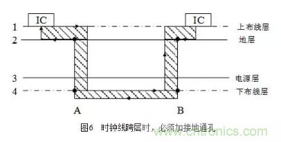 在布線時盡量少穿過孔,因為過孔阻抗和線阻抗不一樣,存在阻抗突變,從而產生駐波使信號變壞,容易形成輻射,尤其是在時鐘需要穿層時,要做技術處理,時鐘線跨層時的處理如圖6所示。
