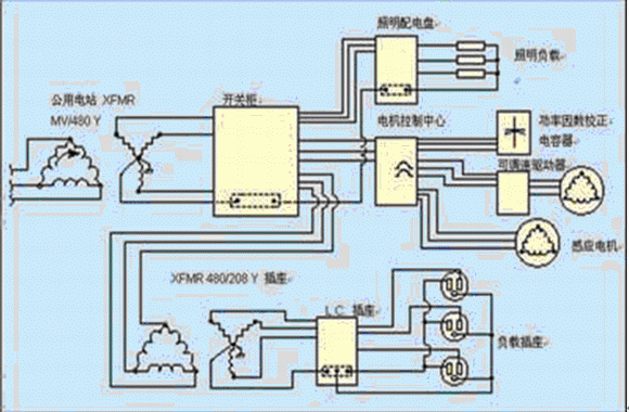 圖1 商業(yè)和工業(yè)設施中典型的簡化配電系統(tǒng)。