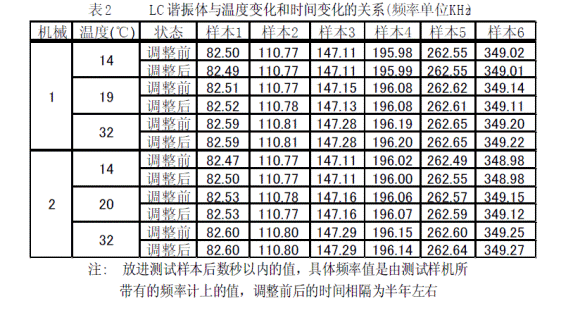 根據(jù)本文中所推出的原理試作了LC諧振頻率測(cè)試機(jī)分別對(duì)6個(gè)種類(lèi)LC諧振體樣本(產(chǎn)品)進(jìn)行測(cè)試。本LC諧振測(cè)試機(jī)已應(yīng)用在6個(gè)種類(lèi)LC諧振體的生產(chǎn)和產(chǎn)品檢驗(yàn)上。具體結(jié)果參照表1和表 2。