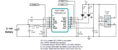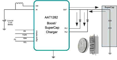 為更好地實(shí)現(xiàn)這一目標(biāo), AAT1282具有防止啟動時過大尖峰電流沖擊的內(nèi)置電路、一個固定的800mA輸入電流限制器、以及一個超級電容充滿電后的負(fù)載斷開電路。其輸出電壓受限于內(nèi)部過壓保護(hù)電路,可防止轉(zhuǎn)換器和超級電容免受一個開路LED(開路條件下)的損害。