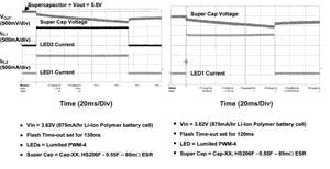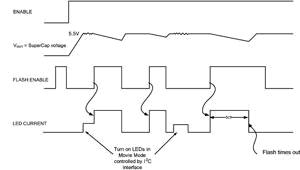 圖3顯示了采用2個以1A電流驅(qū)動的LED閃光燈和1個以2A電流驅(qū)動的LED閃光燈的測試結(jié)果。正如所見到的一樣,超級電容可以很容易地提供閃光持續(xù)120ms所需的電流,同時保持電源電壓充分地高于LED的VF電壓。在兩次閃光之間,超級電容以一個較慢的速率再充電,充電時間在外部設(shè)定,可針對不同的電池尺寸和化學(xué)原理進(jìn)行優(yōu)化。圖4顯示了閃光功能和電影模式選項(xiàng)的數(shù)字控制。