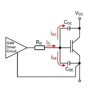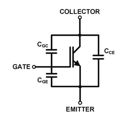 IGBT模塊的開(kāi)關(guān)特性主要取決于半導(dǎo)體電容(電荷)及內(nèi)部和外部的電阻。圖1是IGBT電容的示意圖,其中CGE是柵極-發(fā)射極電容、CCE是集電極-發(fā)射極電容、CGC是柵極-集電極電容(或稱為米勒電容)。