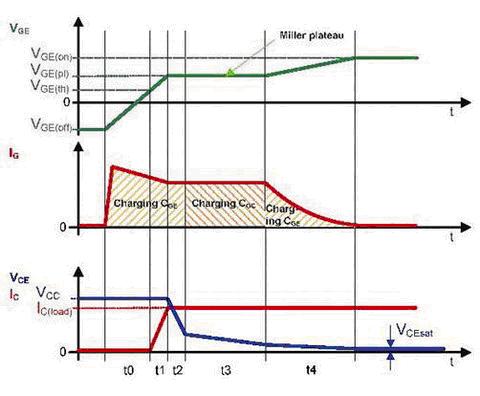 正如IG=f(t)圖所示,導(dǎo)通過(guò)程可以分為三個(gè)階段。分別是柵極-發(fā)射極電容的充電,柵極-集電極電容的充電和柵極-發(fā)射極電容的充電直至IGBT全飽和。柵極電流IG對(duì)輸入電容進(jìn)行充電,IGBT的導(dǎo)通和關(guān)斷特性由與充電過(guò)程有關(guān)的電壓VGE和VCE來(lái)體現(xiàn)。在關(guān)斷期間,所描述的過(guò)程運(yùn)行在相反的方向,電荷必須從柵極上移除。
