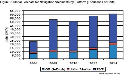 圖5所示為iSuppli公司對于OEM和配件市場的導航出貨量預測。