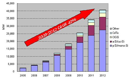 • 2009年薄膜(Thin Film) 太陽能電池的產能達到3.58 GW (35.8億瓦)