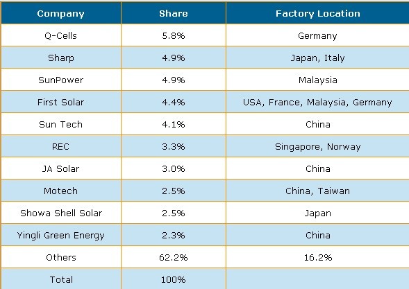 六 :依照2009年全球太陽能電池(Cell)的產能來看,First Solar 是最大廠商,其產能達到10億瓦(1 GW),Q-Cells 與 Suntech 并列第二。在接下來的數年之內,主要的設備投資亦由這些領導廠商所帶動。DisplaySearch預測到2013年,First Solar, Q-Cells, Suntech 等前三大廠商以及JA Solar, Motech, REC, SunPower, Yingli, Showa Shell Solar, and Sharp 等等會是全球前十大供貨商,合計產能將達16GW (160億瓦),將占2013年全球產能的38%。