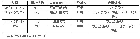 根據(jù)不同傳輸方式,中國(guó)DTV主要分為有線數(shù)字電視、地面數(shù)字電視、衛(wèi)星數(shù)字電視以及IPTV四種類型。(傳統(tǒng)意義上數(shù)字電視分有線、地面及衛(wèi)星三種類型。但AVC認(rèn)為,從應(yīng)用角度來(lái)講,IPTV是數(shù)字電視的一種特殊表現(xiàn)形式,故將IPTV也列入比較之列)