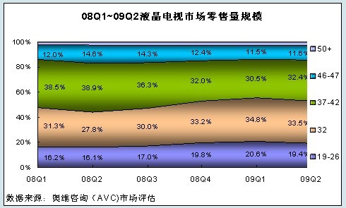 受終端售價快速下降至3000元以內及家電下鄉(xiāng)政策因素的拉動,32英寸及以下規(guī)格在LCD零售內部比重顯著提升;40/46陣營受42vs40和47vs46均價傾壓及上游面板廠供銷策略的影響,在一季度銷量比重有所下降,二季度比重有所提升。