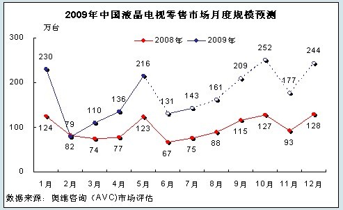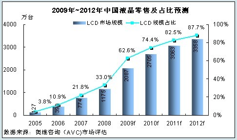 受上半年經濟形勢低迷以及產品替代影響,即使在家電下鄉(xiāng)、節(jié)能補貼、以舊換新三大政策刺激下,2009年全年彩電市場零售量規(guī)模將較2008年下降6.5%。但對于液晶電視來說,則得益于三大政策的刺激,繼續(xù)保持高速增長,預計全年LCD電視市場國內零售量規(guī)模近2100萬臺,出貨規(guī)模可達2400萬臺,LCD電視市場將占總體市場比達到62.6%。