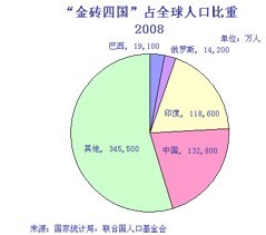 圖1:2008年金磚四國占全球人口比重。數據來源:中國國家統計局,聯合國人口基金會