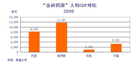圖4:2008年金磚四國人均GDP對比。數據來源:高盛