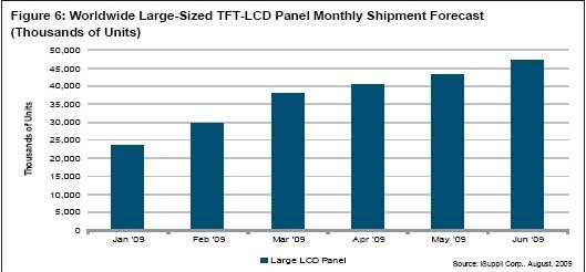 2009年整個第二季度,全球大尺寸LCD面板出貨量比第一季度上升了43%,比2008年第二季度上升了12%。這應歸因于全球經濟好轉、中國市場需求旺盛、新型號的推出、向16:9面板的轉變、以及越來越多地使用LED背光技術。