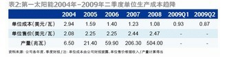 全球第一大薄膜電池廠商第一太陽能(First Solar)以耀眼的財務表現平息了外界對薄膜電池“泡沫”的這一爭議。在經歷了2009年一季度的短暫環比下滑之后,第一太陽能二季度的營業收入達5.26億美元,同比增97%,環比增26%,同時,不僅市場份額有所提升,并且市值在全球光伏廠家中躍居首位(表1)。在晶體硅電池生產成本銳減的背景下,薄膜電池非但沒有失去市場份額,反而憑借不斷改進的技術,頂住組件單價下滑的壓力,將單位生產成本進一步壓縮。