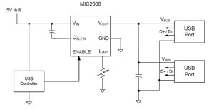 圖7是一種輸出限制電流可調節的USB端口電路。該電路由MIC2008作功率分配開關,由USB控制器對功率分配開關實現控制。限定的電流由外設電阻R來設定(限制電流范圍為0.2~2.0A)。該功率分配開關的輸出電壓上升率(啟動時間)可由外設電容C來設定,內部有過熱保護及輸入電壓過低時輸出鎖存保護。