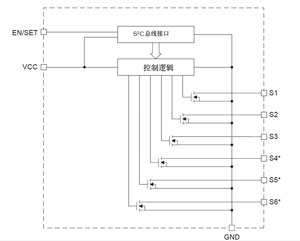 該器件主要特點:輸入電壓范圍為1.8~5.5V;內部有6個低端N溝通MOSFET開關,每個開關都是獨立的;可采用單個串行控制線(S2C線)對各個開關實現通、斷控制;靜態電流少,典型值為3μA;每個開關可驅動208mA;無須其他外圍元件;12引腳TSOP封裝;工作溫度范圍-40~+85℃。