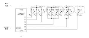 如果有需要也可并接多個RGBLED。S4接D1~D4白光LED,它用作彩色主顯示屏背光照明,S6接閃光燈LED,作相機閃光燈用。根據手機的不同工作狀態,由μP向EW/SET輸入不同的數字信號,可實現LED的負載管理。數字信號的頻率可高達1MHz。利用輸入EN/SET信號使LED亮的時間與滅的時間交替進行,改變亮、滅的時間,可以實現LED亮度調節。