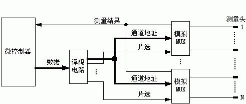 利用圖2所示的電路可方便地對閾值數據進行確定,方法為依次閉合開關對Ⅰ-1、Ⅱ-1;Ⅰ-2、Ⅱ-2;……;Ⅰ-N、Ⅱ-N;形成通路回路,每對開關閉合后,向D/A轉換器送數,所送的數由小到大遞增,并測量此時電壓比較器的輸出,當電壓比較器的輸出由1變為0時,此時的數據與VA相對應。這樣可測得每個通道通路時的VA,也就是一對開關閉合時RON上的電壓降。對于高精度的模擬多路開關而言,其RON的個體差異較小,因此可把系統自動測得的VA的一半近似作為此對開關各自RON上電壓降的對應數據,就是在現行溫度下各模擬開關的閾值數據。