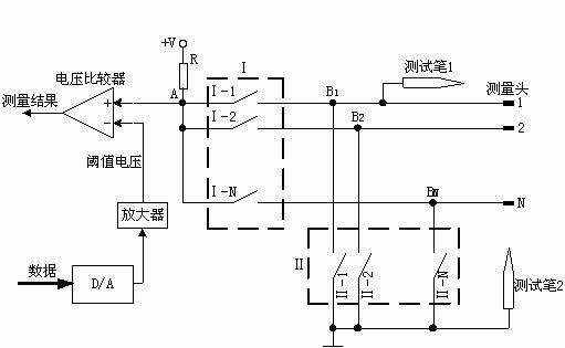 實現自動測量的前提是將被測元件引腳連入探測電路中,為此探測設備設置若干個測量頭,通過電纜引出,測量頭可掛接各種測試夾具與元件引腳建立連接,測量頭的數量決定了同一批連入探測電路的引腳數。然后在程序控制下探測儀按組合原則依次將被測"引腳對"一一納入測量通路。在測量通路中將"引腳對"之間的通/斷路狀況呈現為引腳間有無電阻,測量通路將其轉換為一個電壓量,由此判斷它們之間的通/斷路關系并加以記錄。