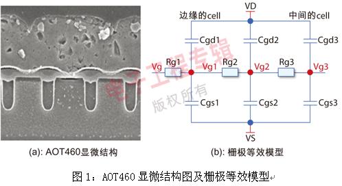通常從外部來看,MOSFET是一個獨立的器件,事實上,在其內部,由許多個單元(小的MOSFET)并聯組成,圖1(a)為AOT460內部顯微結構圖,其內部的柵極等效模型如圖1(b)所示。MOSFET的結構確定了其柵極電路為RC網絡。