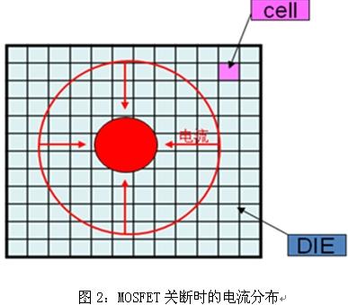 如果MOSFET所加的負載為感性負載,由于電感電流不能突變,導致流過MOSFET的電流向晶元的中間流動,如圖2所示。這樣就會造成MOSFET局部單元過熱而導致MOSFET局部單元損壞。如果加快MOSFET的關斷速度,以盡量讓MOSFET快速關斷,不讓能量產生集聚點,這樣就不會因局部單元過熱而損壞MOSFET。注意到:MOSFET的關斷過程是一個由穩態向非穩態過渡的過程,與此相反,MOSFET在開通時,由于負載的電流是隨著單元的逐漸開通而不斷增加的,因此是一個向穩態過渡的過程,不會出現關斷時產生的能量集聚點。