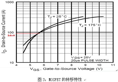 圖3為MOSFET處于飽和區時漏極電流ID與柵極電壓VGS的關系曲線即轉移特性,用公式可表示為:
