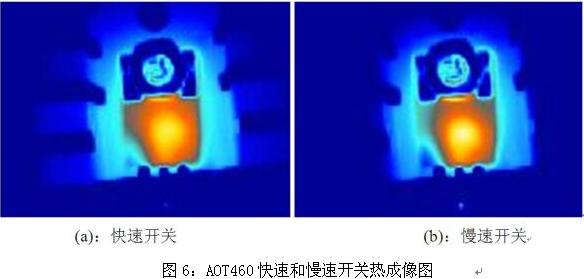 圖6為AOT460在同一應用中快速開關和慢速開關情況下的熱成像照片。可以看出,在慢速開關情況下MOSFET的局部溫度要高于快速開關情況下的溫度,過慢的開關速度會導致MOSFET因局部溫度過高而提前失效。