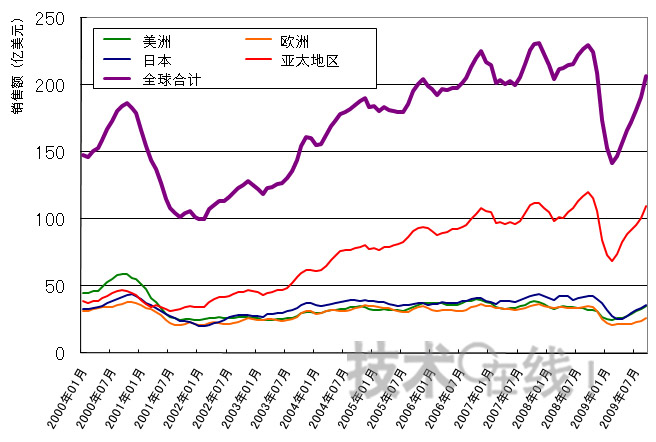 美國半導體工業協會(Semiconductor Industry Association,SIA)統計的數字顯示(英文發布資料),2009年9月全球半導體銷售額為206億4000萬美元(3個月的移動平均值,以下相同),比上月增長8.2%。銷售額已連續7個月環比增加。