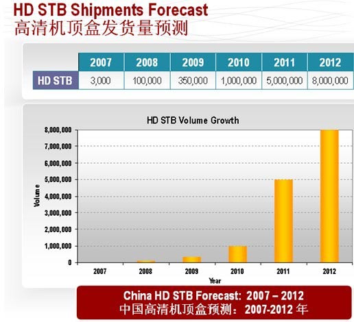 此外,博通特別對高清機頂盒市場做了分析。寬帶通訊事業部資深市場總監JohnGleiter說,由于政府大力推進高清內容進入消費者市場,預示著中國的高清機頂盒產業正式破冰啟航。與此同時,廣電總局要求的九套免費高標清同播的衛視節目將從現在開始不斷完善。在總局內容高清化的時間表中,到2010年,這五套衛視的所有節目都需實現高、標清同播,這就打開了之前制約高清電視發展的內容瓶頸。而高清平板電視機的普及更為高清大發展迎來了契機。目前70%的平板電視機是高清或全高清兼容的,這就意味著購買高清電視機的消費者將成為運營商挖掘的潛在用戶。單一的數字化整轉運營商需要大量的成本投入,現在很多運營商將未來的盈利模式都鎖定在高清和互動兩個方面,所以未來可能有更多的運營商考慮“高清轉換”,這就帶來了有線高清機頂盒將在2010年大幅增長的趨勢。In-Stat預測,到2010年末將交付50萬臺先進的有線電視機頂盒,這些機頂盒都將具有高清處理能力。