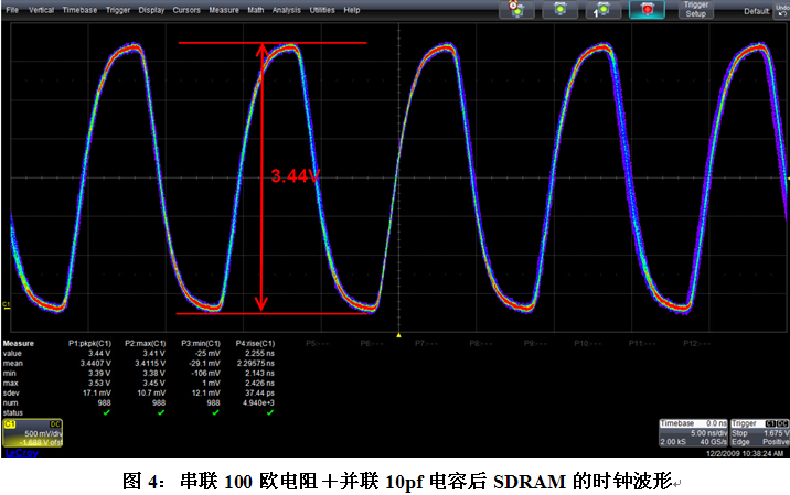 由于電路中ARM的MCU輸出的一路100MHz時鐘要驅動兩個SDRAM芯片,布線上MCU出來的時鐘剛出來就分成兩路后連向兩個SDRAM的時鐘引腳,所以我們采用了在兩路時鐘分支上同時串聯100歐電阻加并聯10pf電容的端接方法。在PCB上割線,焊上電阻和電容后測量的結果如下圖4所示,改進后的時鐘峰峰值為3.44V,波形無過沖,信號質量良好。電路板系統運行正常。