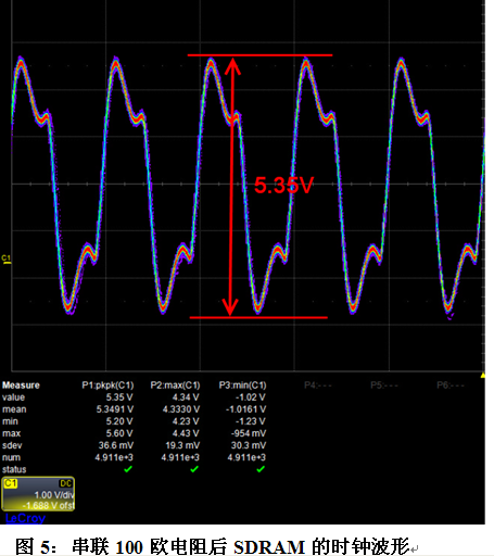 下圖5所示為只串聯100歐電阻時測量到的波形,信號有過沖,峰峰值為5.35V,偏大,對比圖4的端接方法,串聯電阻加上并聯電容是較好的解決方法。