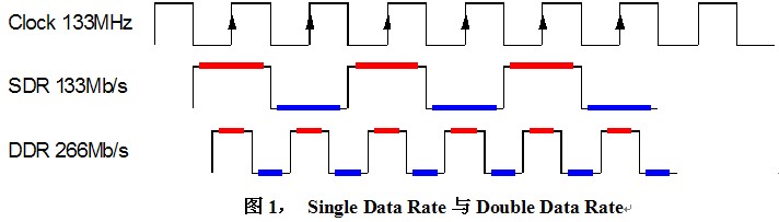 內存技術從SDR,DDR,DDR2,DDR3一路發展而來,傳輸速度以指數遞增,除了晶圓制造工藝的提升因素之外,還因為采用了Double Data Rate以及Prefetch兩項技術。實際上,無論是SDR還是DDR或DDR2、3,內存芯片內部的核心時鐘基本上是保持一致的,都是100MHz到200MHz(某些廠商生產的超頻內存除外)。DDR即Double Data Rate技術使數據傳輸速度較SDR提升了一倍。如下圖所示,SDR僅在時鐘的上升沿傳輸數據,而DDR在時鐘信號上、下沿同時傳輸數據。例如同為133MHz時鐘,DDR卻可以達到266Mb/s的數傳速度。