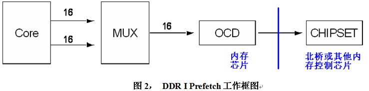 Double Data Rate技術使數據外傳速度提升了一倍,而芯片內部數據數據傳輸速度的提升則是通過Prefetch技術實現的。所謂Prefetch簡單的說就是在一個內核時鐘周期同時尋址多個存儲單元并將這些數據以并行的方式統一傳輸到IO Buffer中,之后以更高的外傳速度將IO Buffer中的數據傳輸出去。這個更高的速度在DDR I上就是通過Double Data Rate實現的,也正因為如此,DDR I外部Clock管腳的頻率與芯片內部的核心頻率是保持一致的。如下圖所示為DDR I 的Prefetch過程中,在16位的內存芯片中一次將2個16bit數據從內核傳輸到外部MUX單元,之后分別在Clock信號的上、下沿分兩次將這2 x 16bit數據傳輸給北橋或其他內存控制器,整個過程經歷的時間恰好為一個內核時鐘周期。
