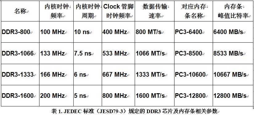 下表列出了JEDEC標準(JESD79-3)規定的DDR3芯片及內存條相關參數。需要說明的是,如前所述,并不是所有的內存產品都完全遵從JEDEC標準,有些廠商會生產速度更高速的DDR3芯片,一般情況下這些芯片是從芯片檢測流程中篩選出來的頻率動態范圍更大的芯片,或者是可加壓超頻工作的芯片。