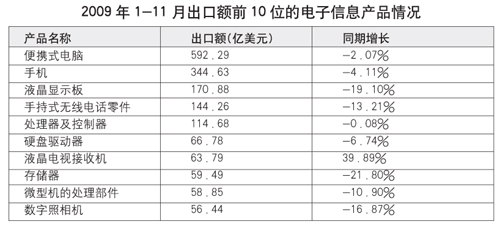 2009年1-11月,電子信息產品累計進出口總額6868.78億美元,同比下降16.66%,比全國商品進出口總額降幅低0.8個百分點,占全國外貿進出口總額的34.97%。