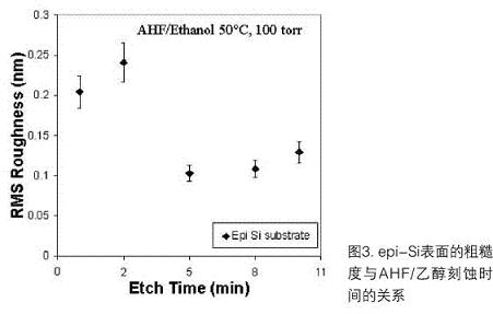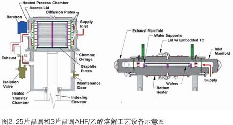 就干法清洗來說,它正用于有選擇的、大多是表面清理的步驟。例子之一是無水HF(AHF)/乙醇溶解工藝,它在多種應用中能有效地從Si表面除去本來有的或化學生成的氧化物。圖2是各種表面加工運作中執行AHF/乙醇溶解工藝的25片晶圓和3片晶圓商品反應器的示意圖。圖3中的AFM結果說明,執行工藝沒有損傷Si表面。