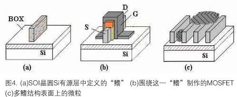 不管哪一種解決方案成為標準,柵氧化前清洗和RIE后密集分布刻蝕在SOI硅中的垂直“鰭”(圖4a)的清理都將成為重要的工藝元素。圖4b顯示了圍繞“鰭”制作的MOSFET例子。