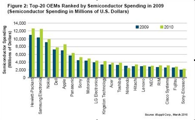 半導體OEM廠商的支出將增長到1779億美元,比2009年的1570億美元增長13%。在這些支出中,以惠普、三星、諾基亞和蘋果等巨頭為首的20大廠商,將占1037億美元或58%。這里所說的OEM支出增長,假定包括最終產品所包含的全部芯片,不管是通過什么渠道購買的——包括OEM直接采購,以及通過EMS或分銷商購買的芯片。