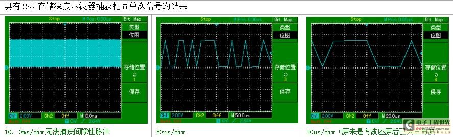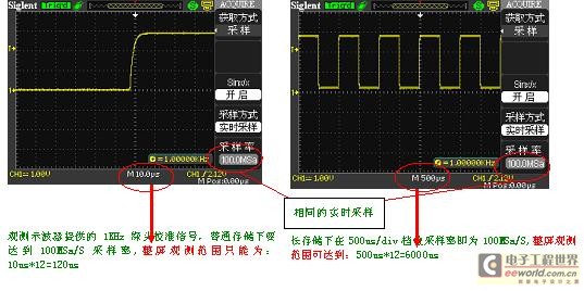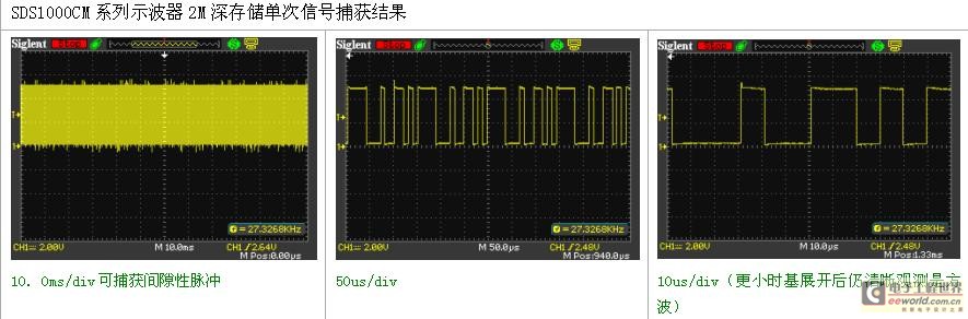 提高示波器的存儲(chǔ)深度可以間接提高示波器的采樣率。以一臺(tái)采樣率為1Gsa/s、存儲(chǔ)深度為20K的示波器為例來(lái)說(shuō),只要水平掃描速度在20ns/div以上時(shí)基,采樣速度就會(huì)急速下降。因?yàn)楫?dāng)需要測(cè)量較長(zhǎng)時(shí)間的信號(hào)波形時(shí),必然要求大的時(shí)基檔位,這就造成采樣率的下降,采樣率的下降可能會(huì)遺漏信號(hào)的細(xì)節(jié)勢(shì)必造成信號(hào)波形質(zhì)量的下降。這時(shí)候就需要大的存儲(chǔ)深度來(lái)維持更高的采樣率來(lái)采樣測(cè)量。長(zhǎng)存儲(chǔ)在保證獲取不失真的波形的同時(shí)又可以觀察更長(zhǎng)時(shí)間的信號(hào)。