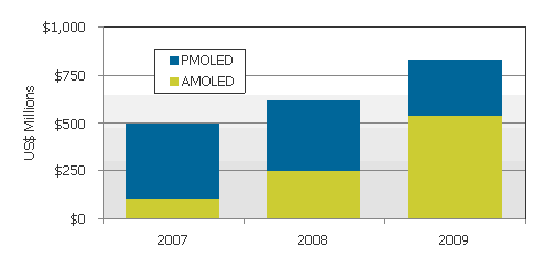 根據(jù)DisplaySearch最新出版OLED出貨及預(yù)測報告指出,2009年全球OLED面板出貨金額達(dá)8億2千6百萬美元,較去年增長35%,主要增長因素來自于手機(jī)主要屏幕對AMOLED面板需求增加。2009年手機(jī)市場對AMOLED面板需求增加不只貢獻(xiàn)了全球OLED出貨提高,同時也使得AMOLED產(chǎn)值首度超越PMOLED;根據(jù)DisplaySearch調(diào)查數(shù)據(jù)表示2009年AMOLED面板出貨金額為5億3千7百萬美元,PMOLED則為2億9千1百萬美元。由于智能型手機(jī)要求大尺寸主動式面板趨勢,取代了許多翻蓋式手機(jī)設(shè)計,而翻蓋式手機(jī)次屏多是采用PMOLED面板,也因此對于PMOLED面板需求產(chǎn)生了一定影響。