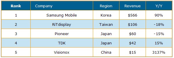 從供貨商排名來看,Samsung Mobile Display遙遙領(lǐng)先其它廠商以5億6千6百萬美元居冠,年成長率高達(dá)90%;臺灣錸寶科技(RiTdisplay)以1億零6百萬美元排名第二,較去年下滑18%;Pioneer位居第三,出貨金額為6千萬美元較去年下滑15%;TDK出貨金額較2008年提高15%,維持第四名地位;中國大陸廠商維信諾(Visionox)出貨金額較去年成長達(dá)1千5百萬美元,排名第五。