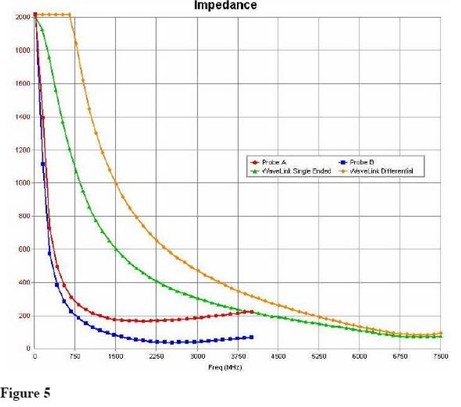 新設(shè)計的探頭輸入阻抗效應(yīng)如何?Figure 5展示了Probe A阻抗 Vs 頻率在有另外一個制造商沒有仔細(xì)考慮減少輸入諧振負(fù)載的Probe B之上。同時,新的WaveLink探頭的負(fù)載效應(yīng)也展示出來。由于是差分探頭,有兩條跡線——第一條顯示了當(dāng)做是單端探頭(負(fù)輸入當(dāng)成是地連接)是時的阻抗,第二條顯示了用平衡源驅(qū)動時的負(fù)載。跡線在每個探頭的最大規(guī)定頻率截止。